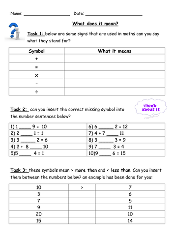 Write the Missing Math Symbols Worksheets Put the missing symbols in the number sentences correctly. Use +, −, ×, ÷ , and =. 1. 2 ___ 3 = 6 (Note: Now, you know that the relation between 2 and 3 to get 6 is the product, so we'll add the multiplication sign between them. Thus, 2 x 3 = 6. 2.